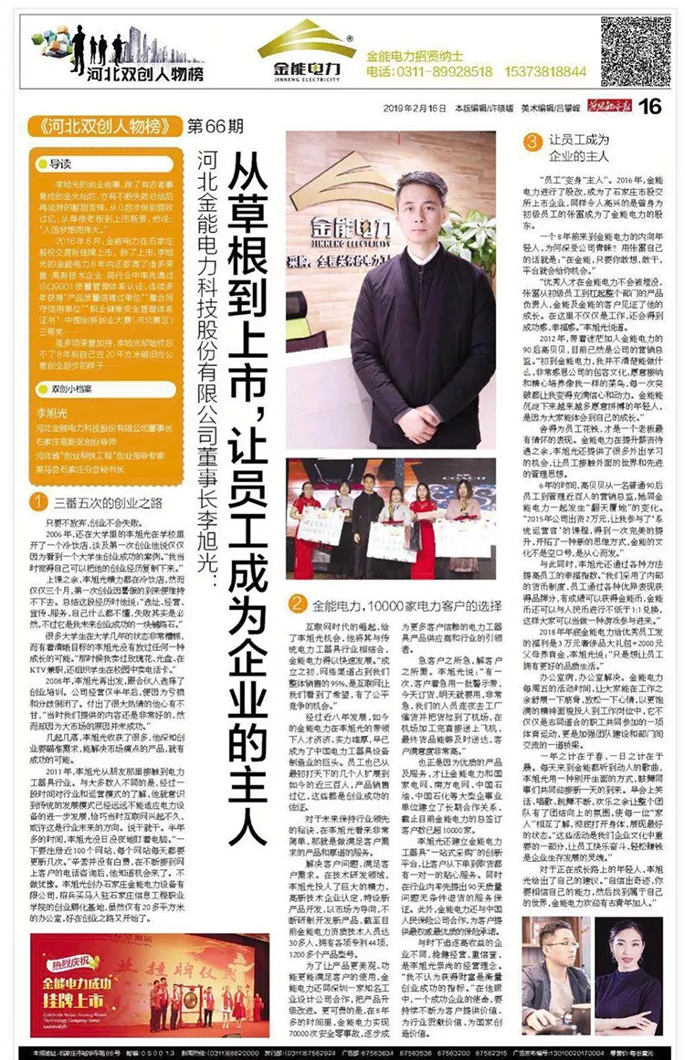 燕趙都市報作為河北省最權威的主流媒體給與金能電力創始人和金能電力的報道: