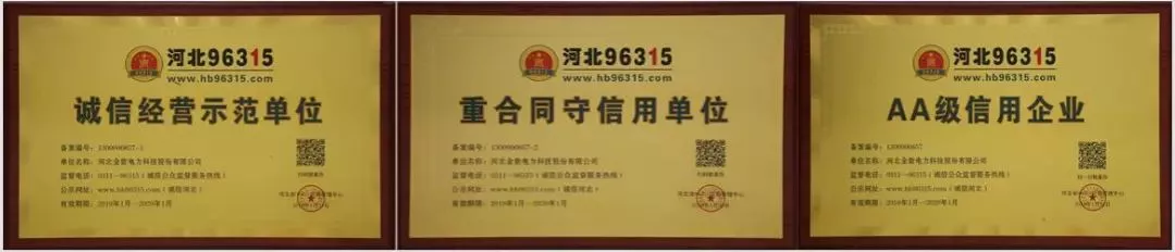 金能電力榮獲河北96315“誠信經營示范單位”、“重合同守信用單位”、“AA級信用企業